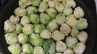 Cut the brussels sprouts in half. Put some olive oil in the pan. Place the halved sprouts flat side down.
